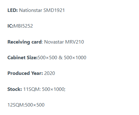 Tato LED obrazovka je vybavena LED žárovkami SMD1921. Specifikace z webu výrobce Gloshine LED naznačují, že mají 4500-5000 nitů, když jsou zcela nové. Našim zákazníkům doporučujeme pouze kvalitní použité LED displeje a věříme, že vaše investice se vám po několika nájmech vrátí, pokud jste výrobní společností. Očekáváme, že u provozoven, které je chtějí nainstalovat a používat jednou týdně, vydrží po mnoho let.